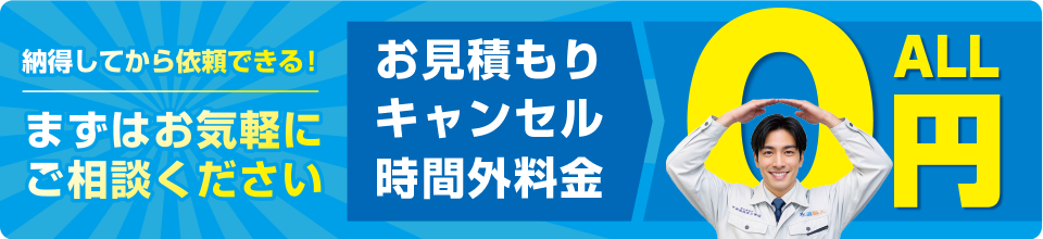ご相談・ご訪問・お見積りは無料です。実際の作業に入るまでは一切無料ですので、ご安心ください。 365日24時間対応可能ですので、急なトラブルでも迅速にご対応させていただきます。