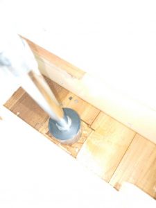 排水ジャバラホースを防臭キャップごと抜き出します。それから薬品を排水管内へ直接投与して、パイプに直接スパッドを打ち込んで行きます。