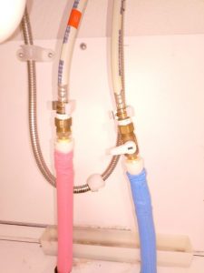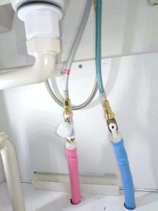 お湯側に止水栓を取付けて、給水管の長さを整えて蛇口のホースを接続していきます。
