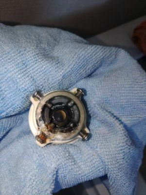 ニップル内のパッキンの変形、蛇口スパウトの錆が見られました。