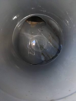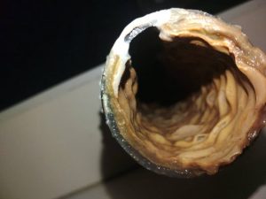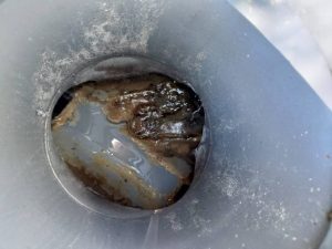 油の塊が配管の内側に溜まっています。水は流れはしますが、こういった汚れが溜まると配管が狭くなり、水を通せる量が減り一旦上がって来てしまいます。
