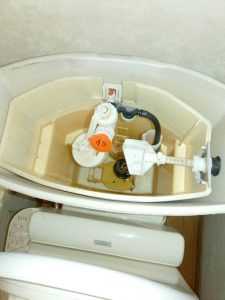 お客様からトイレの水漏れを見て欲しいとご連絡いただきました。早速、駆けつけます。タンクの中に水が溜まっていないと言う事で、オレンジの部分を外したら戻せなくなったそうです。