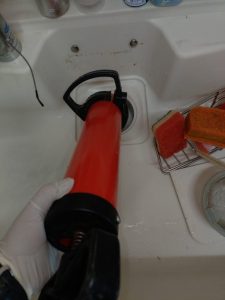 お客様に現状を説明し、今回は空気圧を使ったポンプで詰まり除去を行いました。