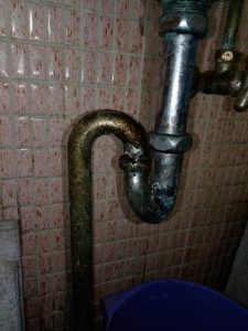 点検してみるとSトラップからの水漏れでポタポタしている様子でした。原因はと言うと40年近く使っていることによる経年劣化で、排水の水漏れを起こしていました。