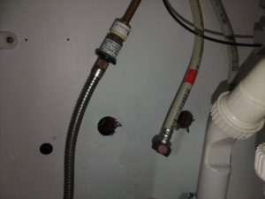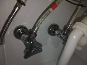 到着して状況を確認してみると、止水栓からぽたぽたと水が止まらずに落ちてきています。このままだと洗面台が濡れて大変なことになっています。