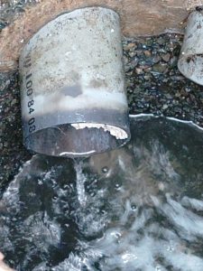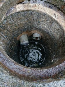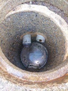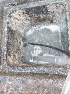 屋外の排水管やインバート桝を点検させて頂くと、満水で溢れかえっていて、最終桝だけ錆び付いていて中々開けることが出来ないと仰られていました。