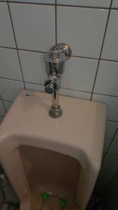 小便器に取り付けてあるフラッシュバルブの劣化により水が止まらなくなっていると判断しました。