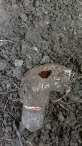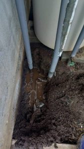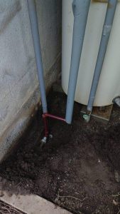 給湯器付近の地面から水が噴き出して、お湯が使えなくなったとの事でした。まずは地面を掘り、原因箇所の特定をします。