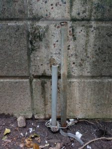 塩ビの配管を使っていて、支えも十分ではないので物が当たった衝撃で折れてしまったようです。