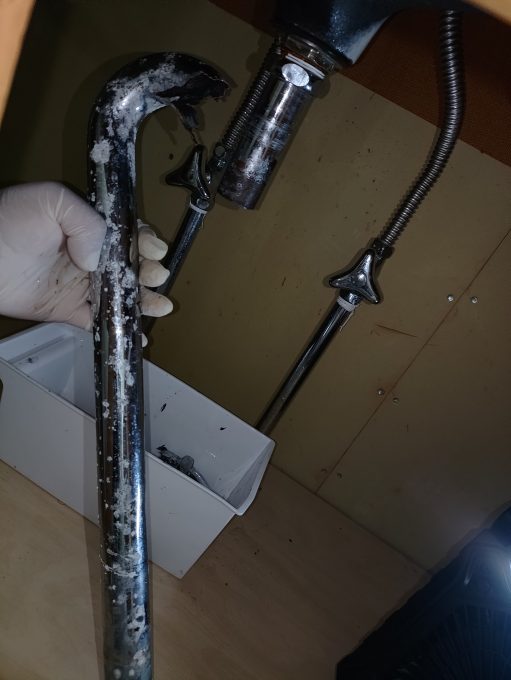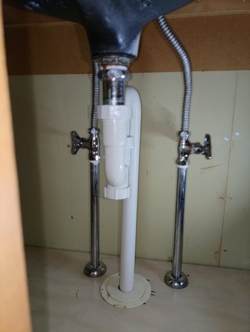 お客様と相談し、今回はメッキの管ではなく、樹脂製の排水トラップへと交換を行いました。