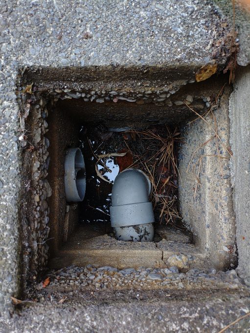 点検させて頂きますと、屋外雑排水管の詰まりです。インバート桝が油汚れや草木やゴミ等が堆積し、流れを悪くしていました。
