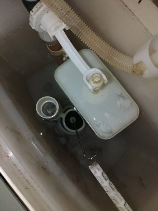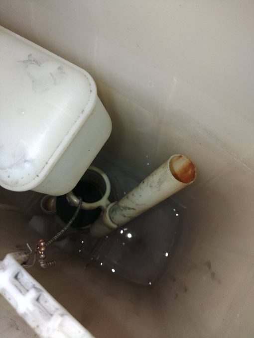 早速点検してみますと、オーバーフロー管が根本から折れており、以前から水漏れして微調整して漏れないようにしていたが、折れてしまったとのことです。