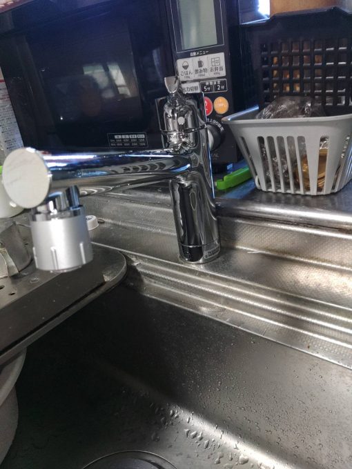 お客様とご相談した結果、上げ吐水の蛇口のほうが止水しやすいとのことでしたので、蛇口交換でご提案させて頂きました。