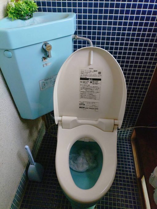 トイレットペーパーが詰まってしまっていることと、以前も詰まりの除去をしたがまた詰まってしまったということもあり、つまりの原因として、トイレ自体に尿石が付着して詰まりやすくなっており、再発する恐れがあるため、お客様と相談しトイレ交換のご依頼をいただきました。