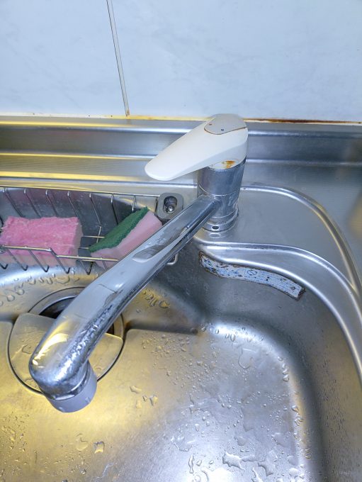 使用年数…おおよそ25年目の台所蛇口の故障でした。上のハンドル上部も取れてしまっていて、ハンドルの開け締めが出来ず、台所で洗い物が出来ない状態でした。