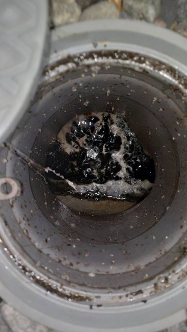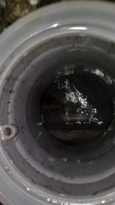 排水管を点検すると、管内に詰まりが発生しており、これが原因で流れを堰き止めてしまっていた為、高圧洗浄機にて除去致しました。