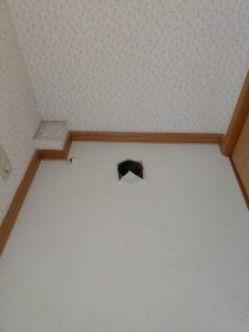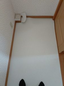 点検すると、タンクを固定しているボルトが折れていることが分かりました。お客様に現状をお伝えし、今回はトイレの交換と、クッションフロアの張替えを行いました。
