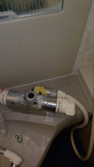 浴室蛇口の故障とご依頼を頂き伺いました。スパウト部が折れていたり、シャワーホース接続部が破損しテープで応急処置をしてある状態でした。