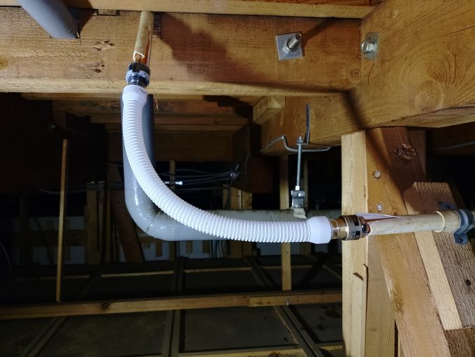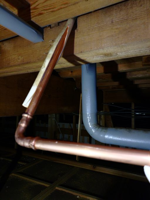 天井裏を点検すると、給湯管から水漏れしていることが分かりました。現状をお客様にお伝えし、今回は給湯管の一部補修を行うことになりました。