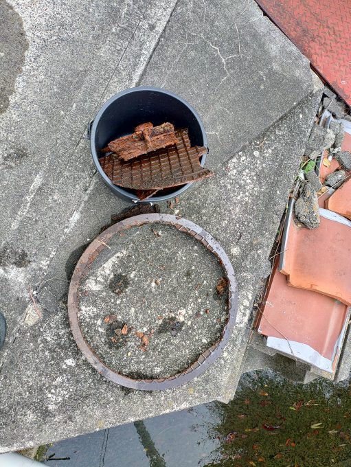 現場を確認していくと、マンホールは錆びて強度が低下し割れてしまいましたが、基礎の部分はそのまま使えそうです。お客様に現状をお伝えし、今回は蓋のみ交換となりました。