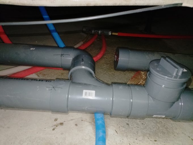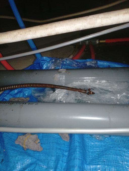点検していくと、トイレの先の排水管で詰まっていることが確認出来ました。今回は屋外の点検口が無く高圧洗浄も難しい為、宅内で排水管をバイパスしました。